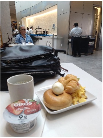 ダラスからシカゴ行きの飛行機に乗り継ぐためにはターミナルを移動しなくてはならない。ここで本領を発揮するのが車いすのアシスタンス。ダラスの大空港を歩いてターミナルを移動するのは大きな労力がかかるが、電動カートが迎えに来てくれて人をかき分けながら、らくらくターミナル移動。乗り継ぎ時間がまだ3時間ほどあるので再びラウンジの人となり朝食タイム。