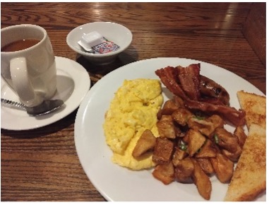 米国朝食定番のトースト、ベーコン、エッグ、ポテトとコーヒー。ポテトは大好物のボイルドポテトを炒めたもので大満足。ベーコンはお決まりのカリカリ。昨日からの機内食とラウンジ飯に飽きてきたのも手伝って美味いし、現在の米国の物価にしては安い20ドルだったので気分が良くなって彼女にチップを弾む、いかれたオヤジ。コーヒーのおかわり忘れた(笑)